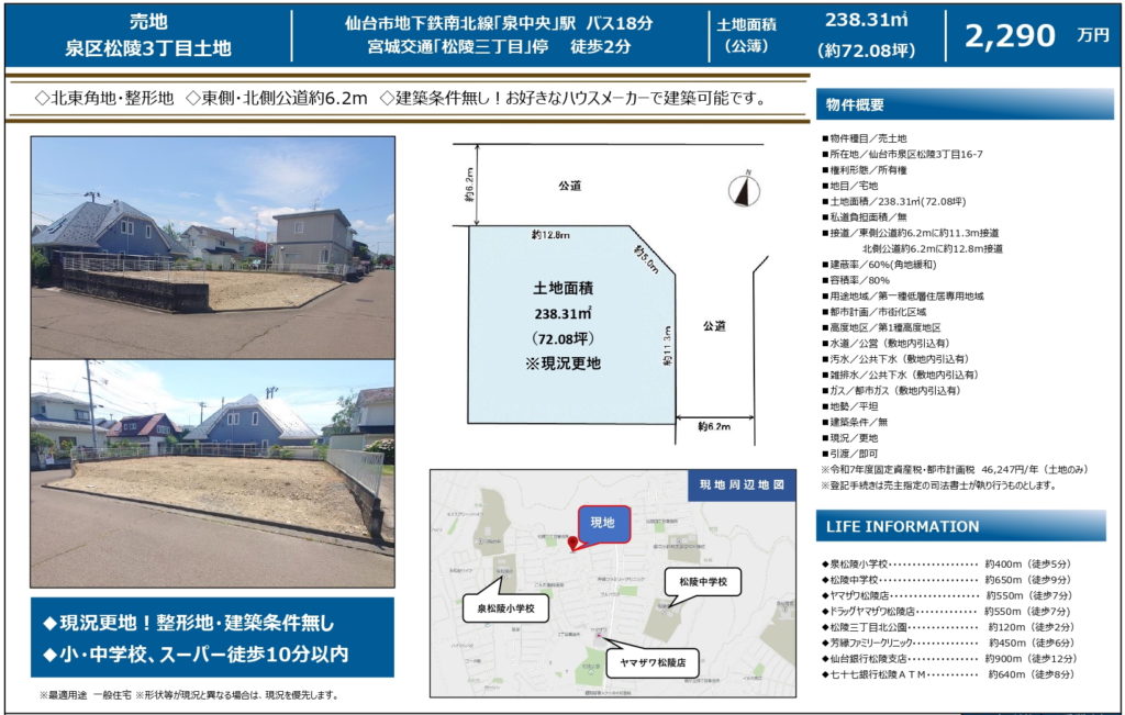 北東角地!建築条件なし・平坦地!