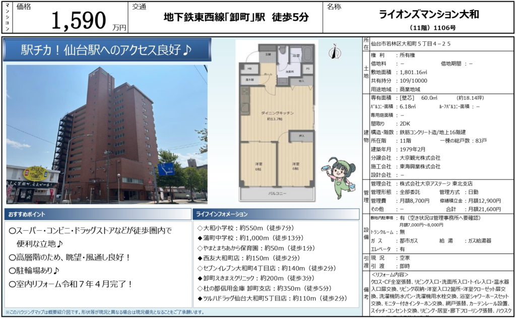 【大和町】ライオンズマンション大和 2DK 1,590万円