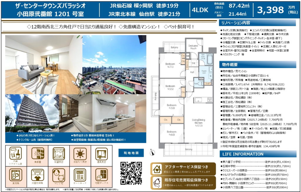 リノベーション物件!三方角住戸・免震構造・ペット飼育可!榴ヶ岡駅へ徒歩19分♪