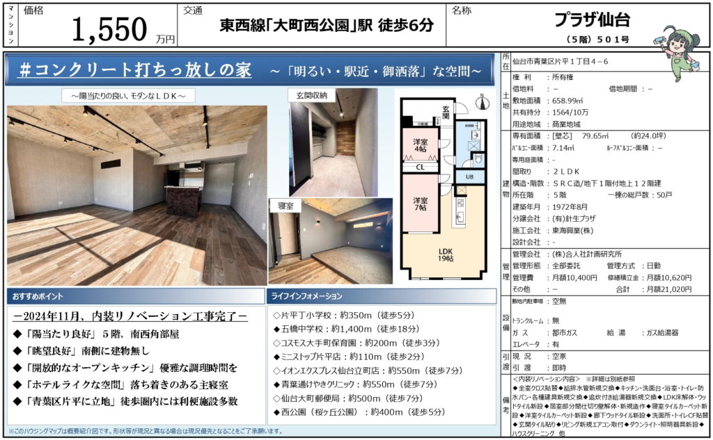 【片平】プラザ仙台 2LDK 1,550万円