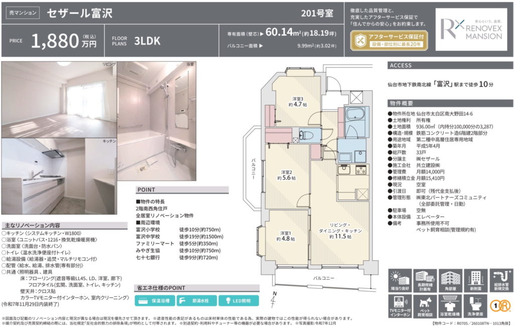 リノベーション物件!南西角住戸!富沢駅へ徒歩10分♪