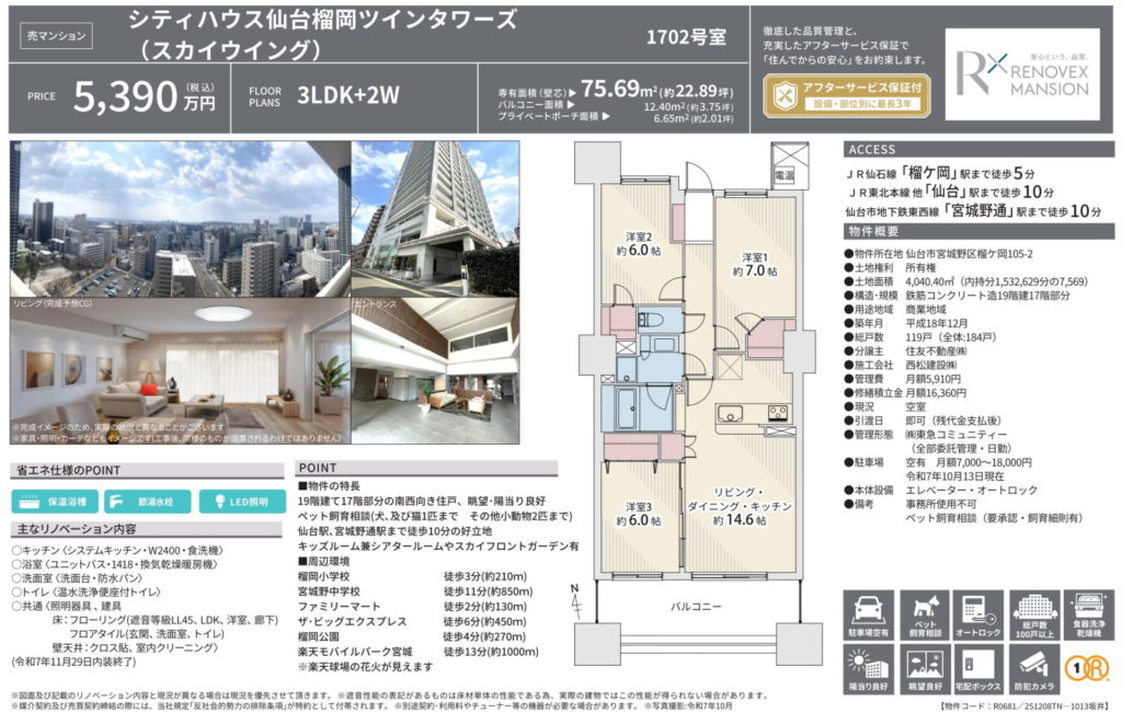 【榴ヶ岡】シティハウス仙台榴岡ツインタワーズ(スカイウイング) 3LDK 5,390万円