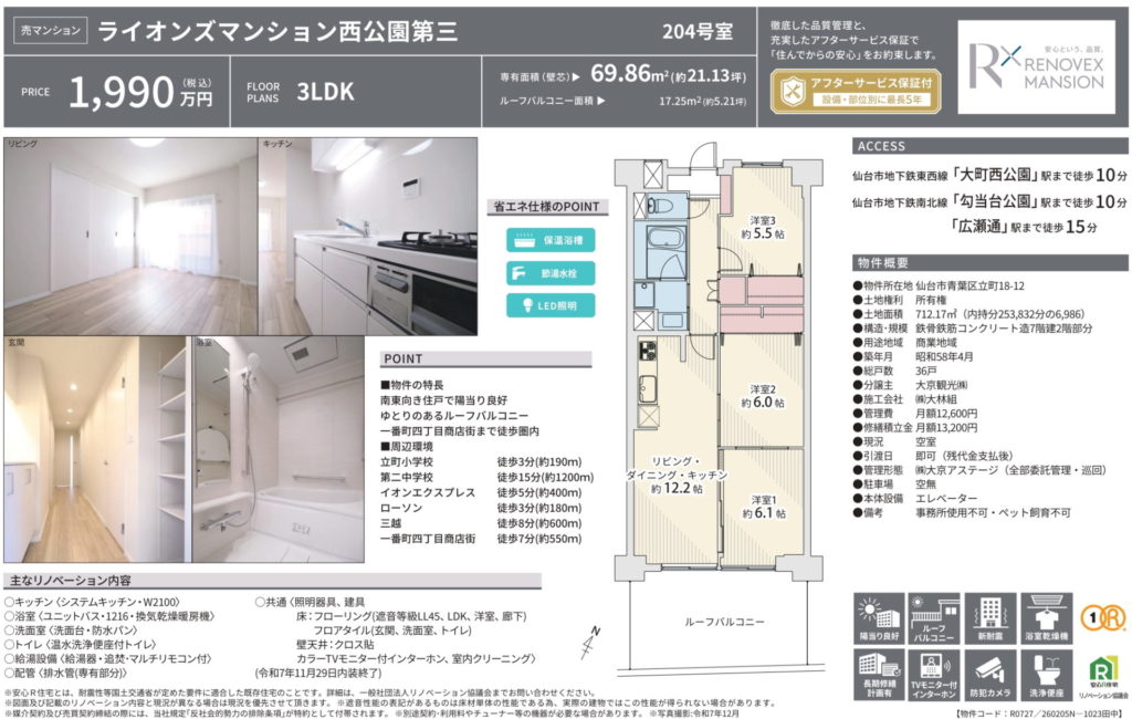 【立町】ライオンズマンション西公園第三 3LDK 1,990万円