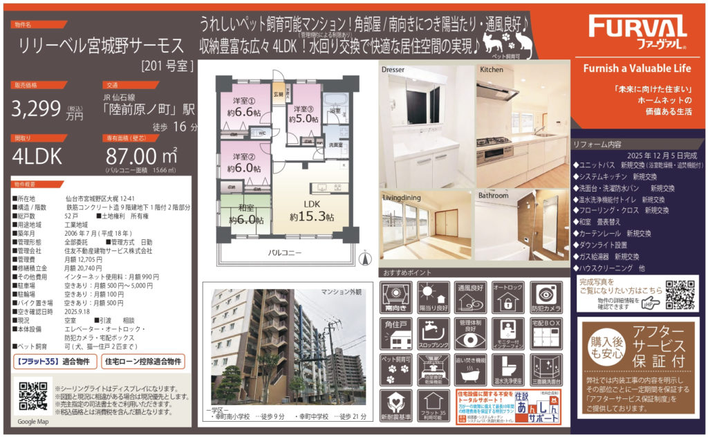 リノベーション物件!角住戸・ペット飼育可!陸前原ノ町駅へ徒歩16分♪