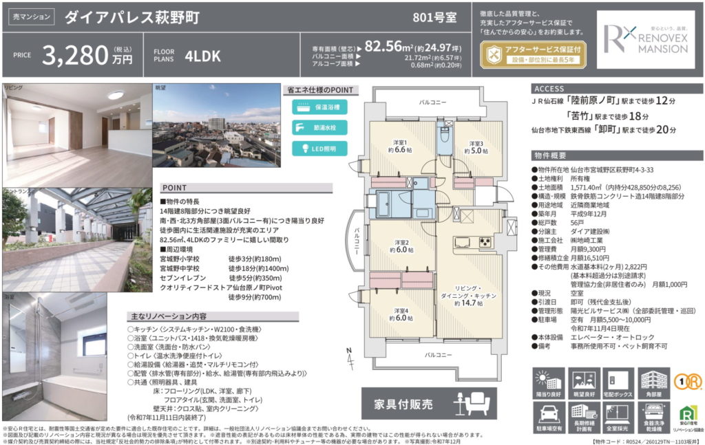 リノベーション物件!角住戸・3面バルコニー!陸前原ノ町駅へ徒歩12分♪