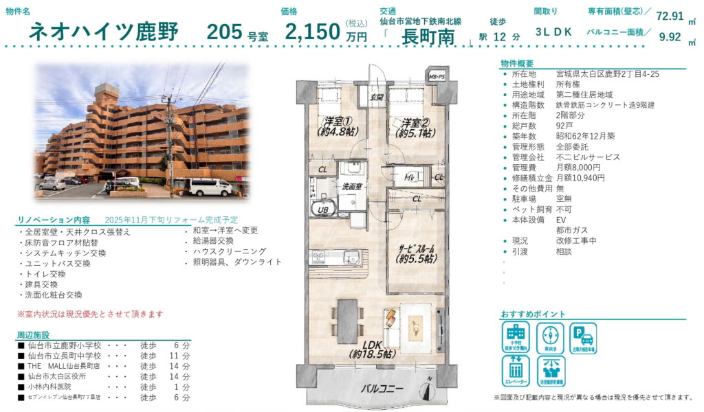 リノベーション物件!免震構造!長町駅へ徒歩15分♪ 物件概要