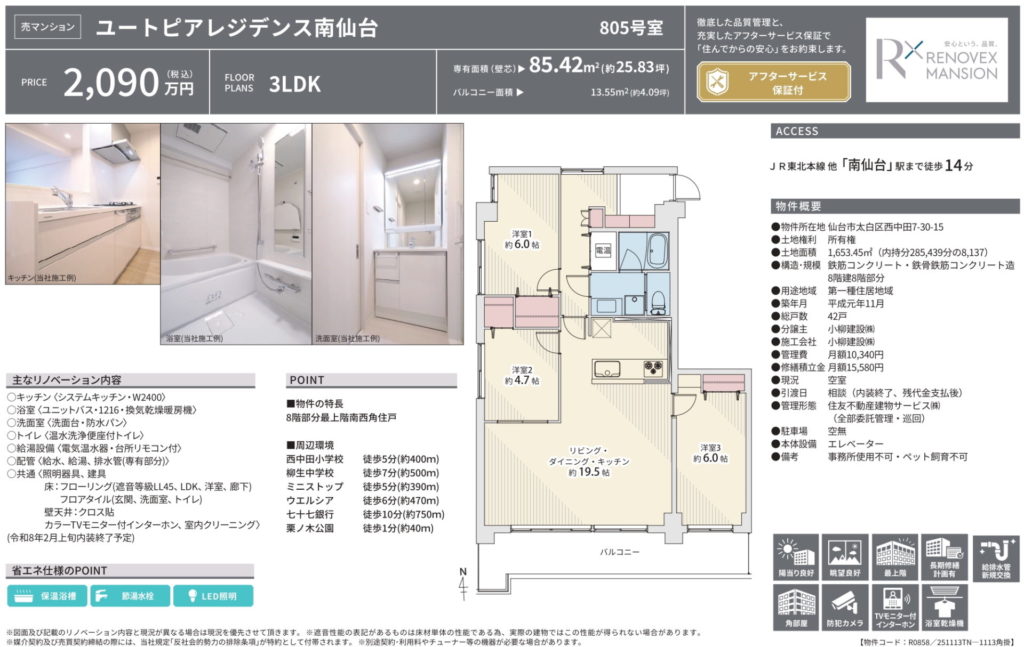 【西中田】ユートピアレジデンス南仙台 3LDK 2,090万円