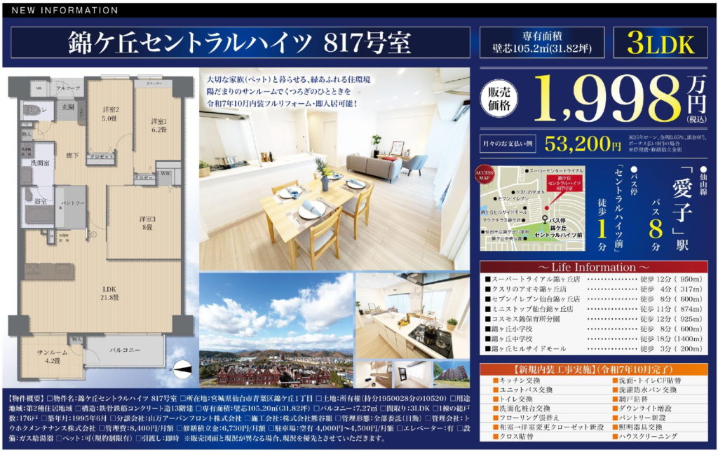 【錦ケ丘】錦ケ丘セントラルハイツ 3LDK 1,998万円