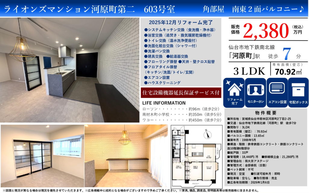 リノベーション物件!角住戸!河原町駅へ徒歩7分♪