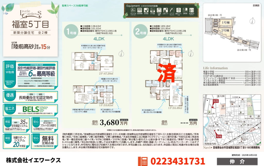 仙台ゼロ不動産【福室】新築一戸建て 4LDK 【ご成約となりました♪】【仲介手数料無料対象】 成約済 2026.02.02 2026.01.18 長期優良住宅!駐車3台可!陸前高砂駅へ徒歩15分♪ 物件概要