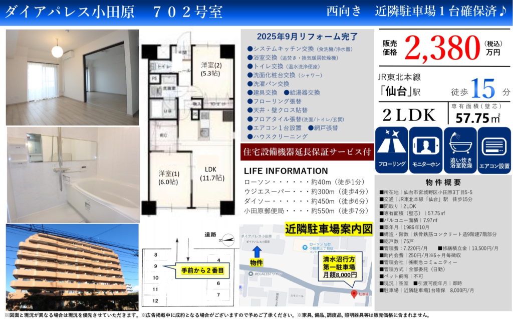 リノベーション物件!近隣駐車場1台確保!仙台駅へ徒歩15分♪