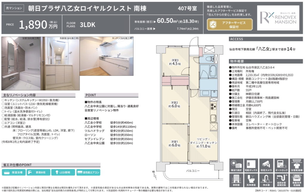 【八乙女】朝日プラザ八乙女ロイヤルクレスト 3LDK 1,890万円