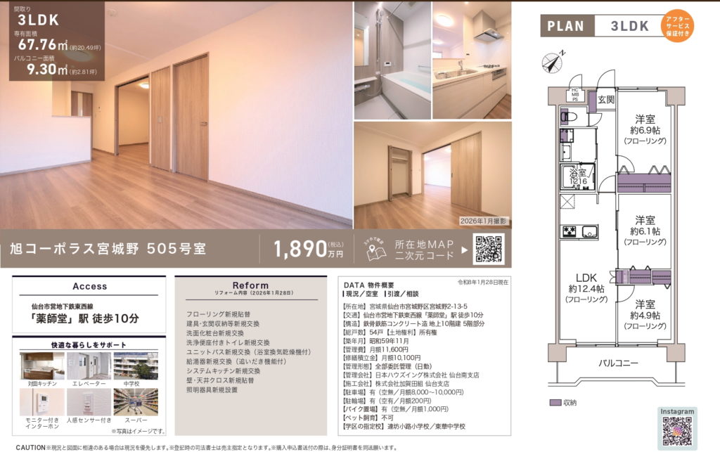 【宮城野】旭コーポラス宮城野 3LDK 1,890万円