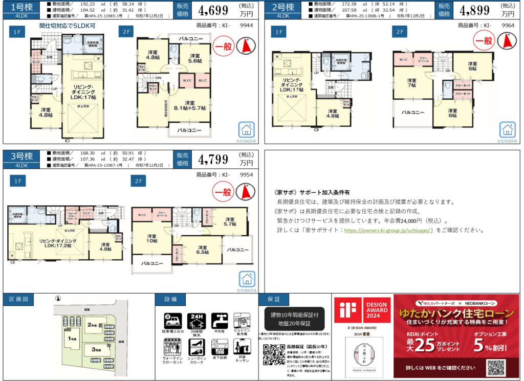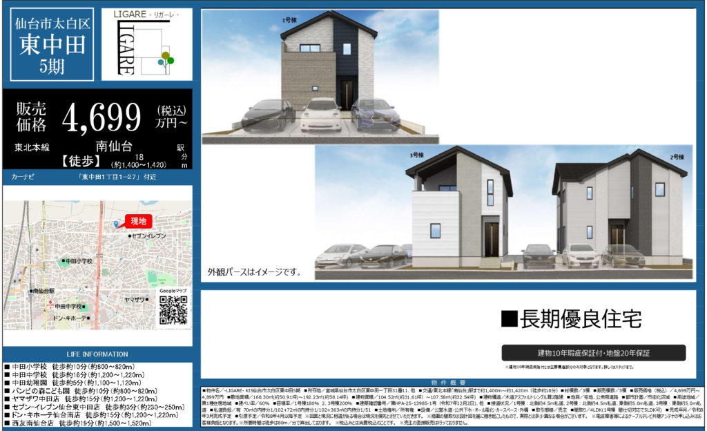 【東中田】新築一戸建て 4LDK 1号棟 4,699万円 2号棟 4,899万円 3号棟 4,799万円 仲介手数料0円 2026.03.16 長期優良住宅!オール電化!南仙台駅へ徒歩18分♪ 物件概要