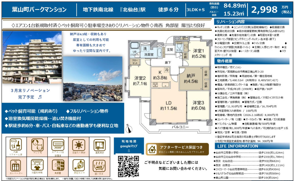 リノベーション物件!南西角住戸・ペット飼育可!北仙台駅へ徒歩6分♪