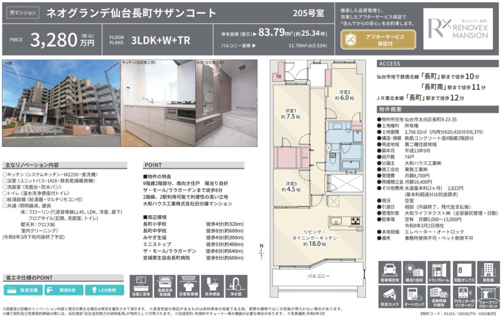【長町】ネオグランデ仙台長町 3LDK 3,280万円